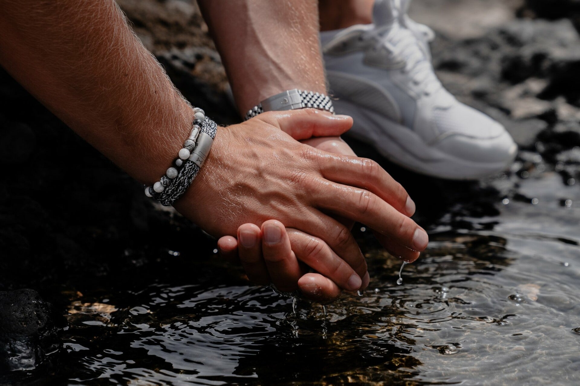 Voor de kralenarmbanden worden in de meeste gevallen edelstenen gebruikt, soms natuurstenen (denk aan lava) of een composiet als edelsteen te duur is. Door de kralen (beads) rijgen we een siliconen koord van hoogwaardige kwaliteit, en het koord wordt via een speciale methode stevig vastgezet in het slot. De meeste leren armbanden worden gemaakt door de beste leervlechters uit Bali en het zilver wordt gemaakt door de beste zilversmeden op dat eiland. Elk stukje zilver is handgemaakt, zelfs de schakelarmbanden worden schakel voor schakel in elkaar gezet.