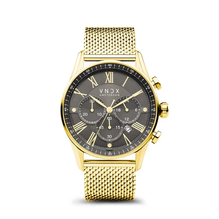The Chief, een veelzijdig horloge met een 45 mm kastdiameter. Dit tijdloze horloge biedt handige functies, waaronder een datumaanduiding, stopwatch en 24-uurs klok, aangedreven door een krachtige chronograaf. De grijze wijzerplaat ademt elegantie met zijn tijdloze Romeinse index. Uitgerust met een stevige stalen mesh band en een verstelbare sluiting voor de ideale pasvorm. Dankzij de waterdichtheid van 10 ATM is dit horloge ideaal voor de waterliefhebbers. Kies voor The Chief en beheer je tijd met stijl en precisie.